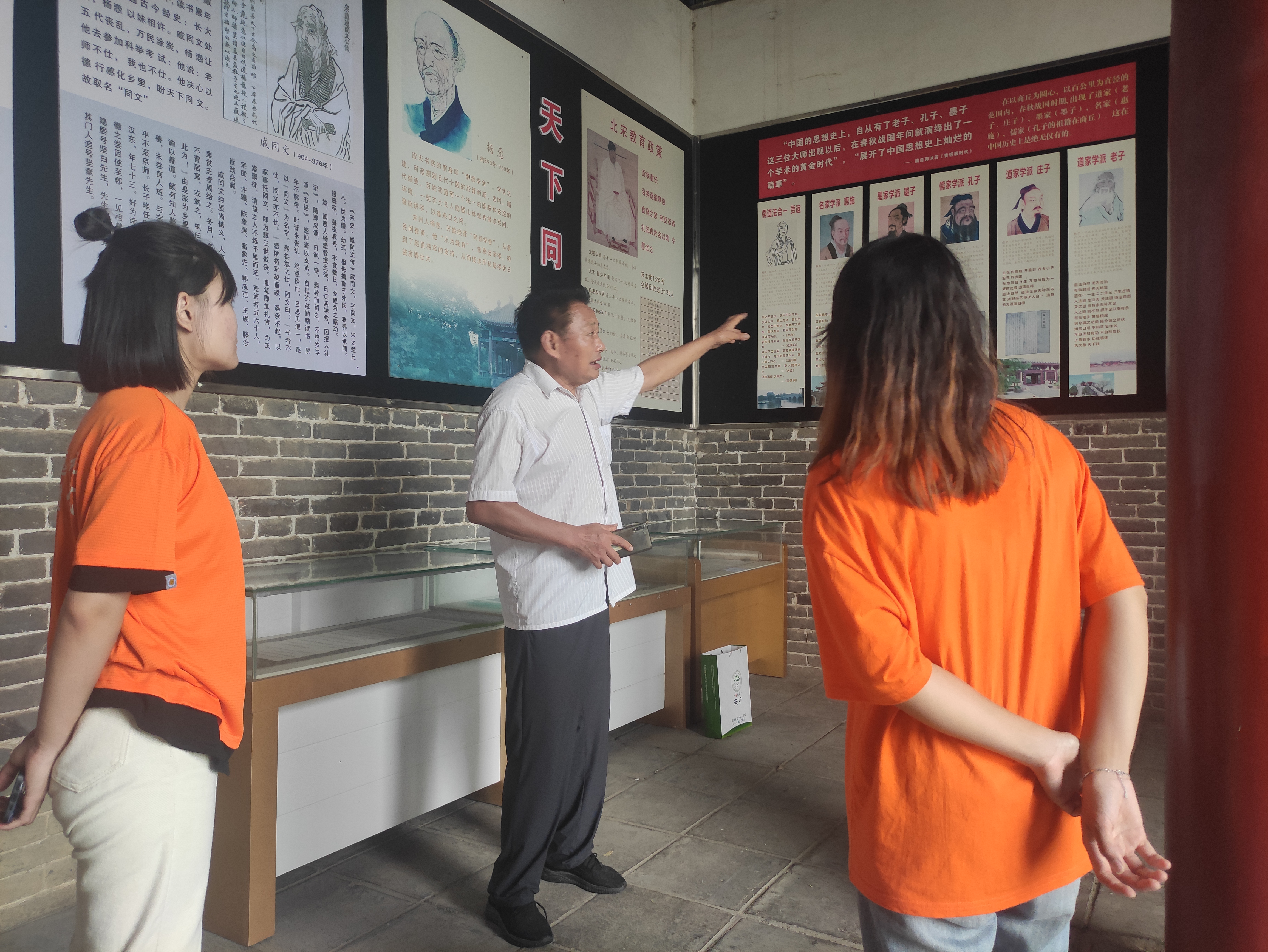 “聆听历史声音,追寻文化遗迹”,为了从书院这一千年文化积淀中汲取智慧,萃取精华,团队成员前往书院对游客和工作人员进行了实地采访。调研期间,团队成员了解到:在到访人数及类别方面,应天书院每年的人流量实际并不多,去参观的游客大多是经过朋友推荐或是当地人前去游玩,游客中70%是中年人,25%是年轻人,5%是中小学生;在了解程度方面,多数游客对应天书院的了解程度局限于“知道、听说过”,并没有深入或专门学习过,甚至还有市民和学生没有去参观的想法,不过据悉应天书院是许多学者以及历史研究者、爱好者的首选,商丘市大中小学教师大多也对应天书院的历史有所了解。在调研的过程中,团队有幸采访到了中国范仲淹研究会理事,商丘市范仲淹研究会副会长——孙纲先生,他表示有很多高校的学生会在实践中将应天书院作为调研项目,但是书院还未建立起“一院一校”的合作关系并定期开展参观教育。虽然书院的规模不大、建筑不多,但其所蕴藏的文化底蕴足够学生为之前往并深入钻研,希望未来学校教育中能更多融入对应天书院的宣传和介绍,加强学生的国学教育,激发学生对传统文化的学习热情。