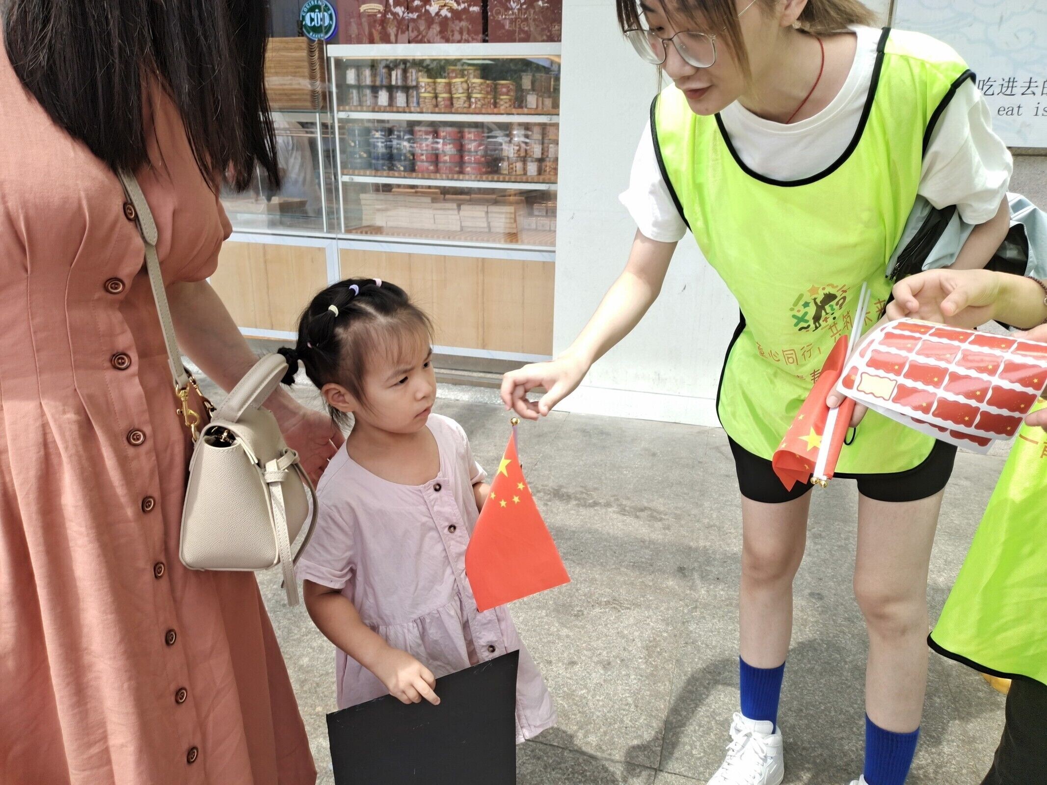 恰逢建党一百周年,勇承时代担当。南京师范大学泰州学院“童心同行,共筑未来”青春志愿行团队兵分两路,一队在常熟市捞品城内免费分发小国旗与国旗贴纸,送上对祖国的祝福,铭记党恩歌颂中华,进行“青春志愿行”活动。 此外,另一拨常熟小分队正在进行“青春赞赞行”,与常熟招商城负责人联系,给未戴口罩者免费分发口罩 ,戴上即可免费领取一瓶矿泉水。