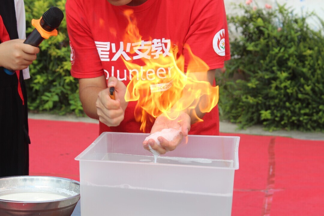 图为科学老师为了让同学们更加深入了解科学在文艺汇演节目表演的科学实验 “手中生火”。神奇的火焰在掌中燃烧,志愿者老师用他的方式展现了科学的魅力。