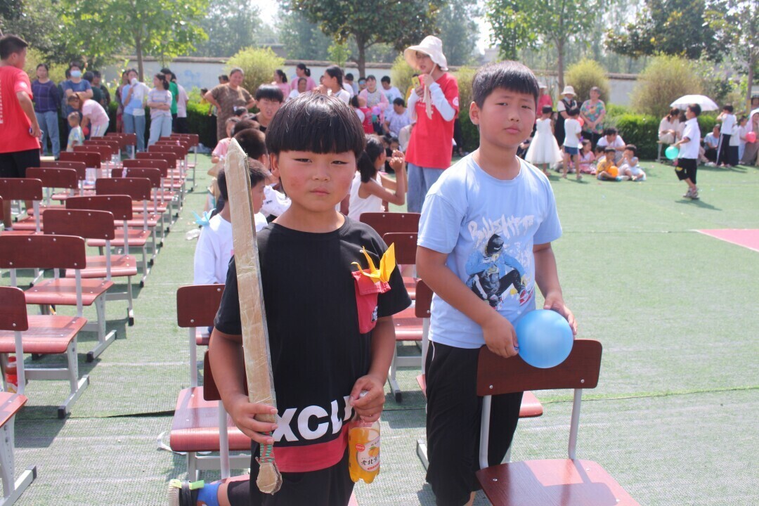 图为创意 T 台秀表演过程中,男同学挥舞着自己制作的武器,女同学拿着自己制作的小扇子,在舞台上自信的走着。天马行空的想象,儿童用自己的奇思妙想勾勒着属于他们的多彩童年。