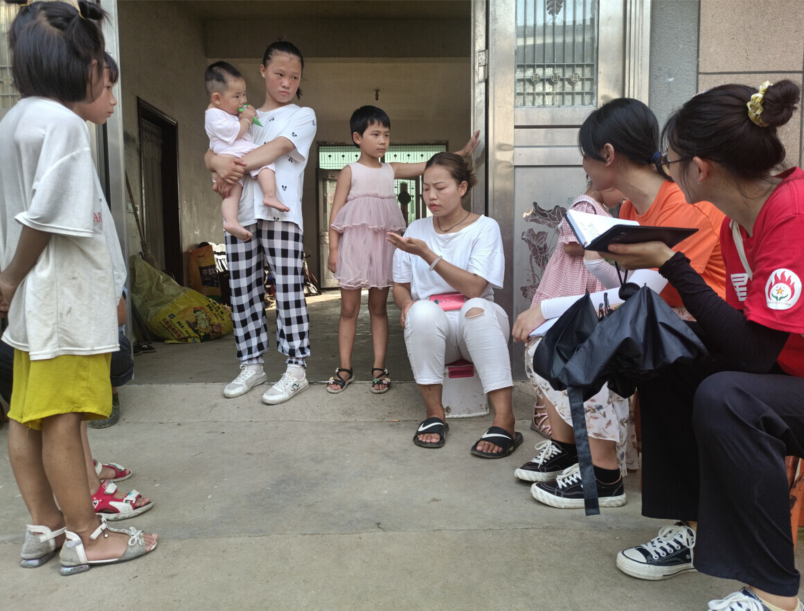 图为家访调研,团队志愿者和学生家长交流沟通中景照片。
