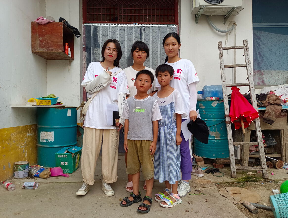 图为家访调研,团队志愿者和孩子们共同前往家里,途中拍摄照片。
