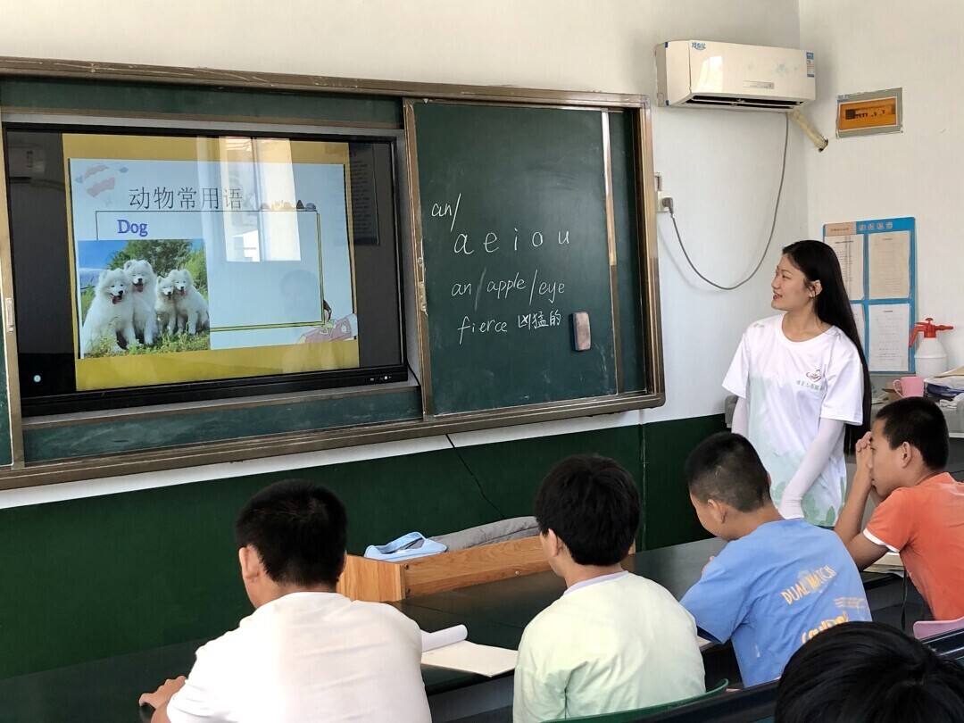 课上,曹璇首先进行了生动活泼的自我介绍,其余志愿者在后方维持秩序,她用精美的图片引导孩子们认识动物,学习有关动物的日常习语。孩子们对此反响剧烈。上课时孩子们认真听课,积极笔记,课堂气氛十分活跃,课堂参与度很高,气氛十分活跃。课堂最后,曹璇还为孩子们布置了用英语写关于自己喜欢的动物的一句话,孩子们积极完成,有遇到困难的地方也会主动询问志愿服务队成员获得帮助。孩子们对志愿者们很是好奇,提出很多问题,志愿者们都耐心的予以回答。