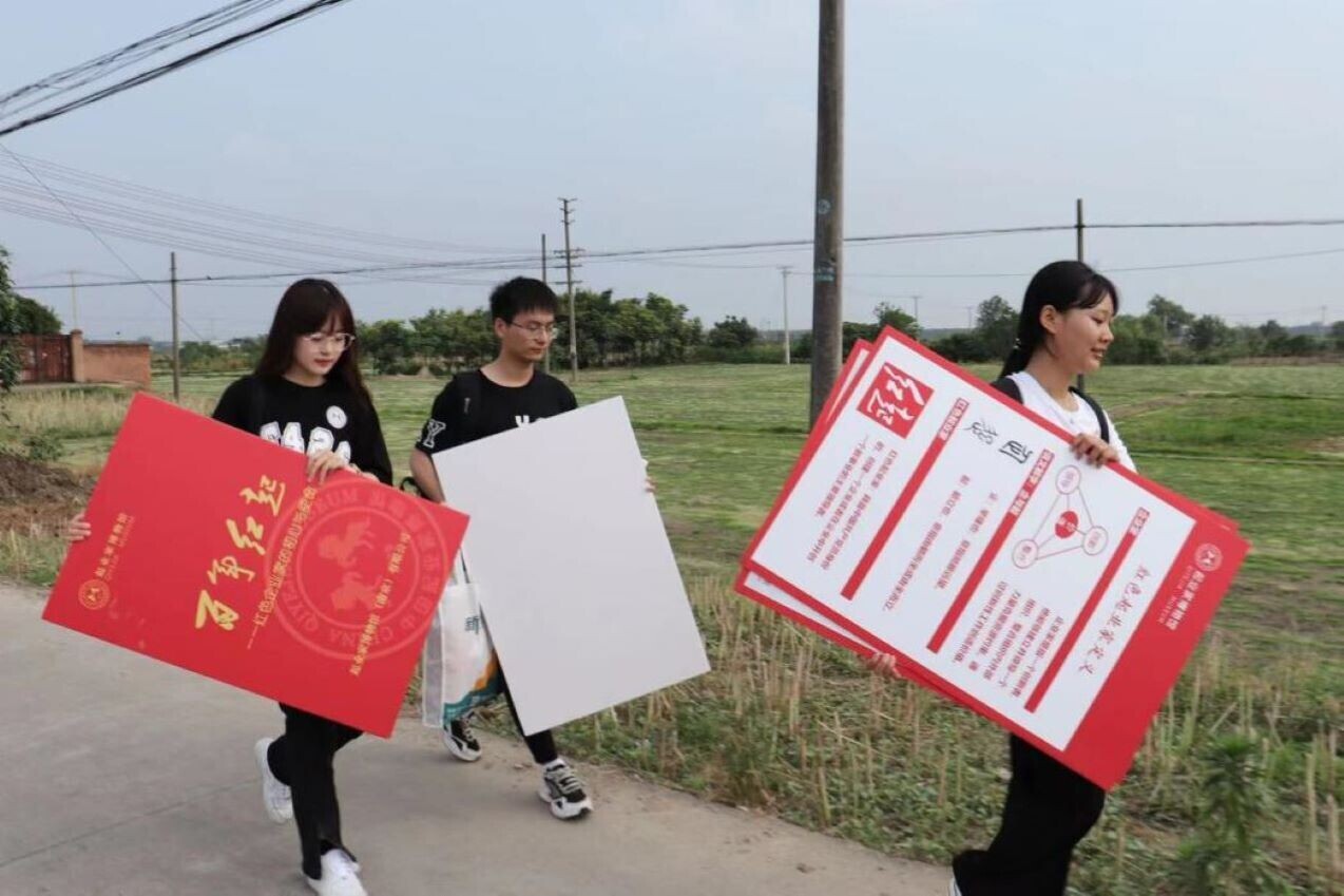 图为实践团成员带着移动展板到五星村宣讲。通讯员 杨赫 摄